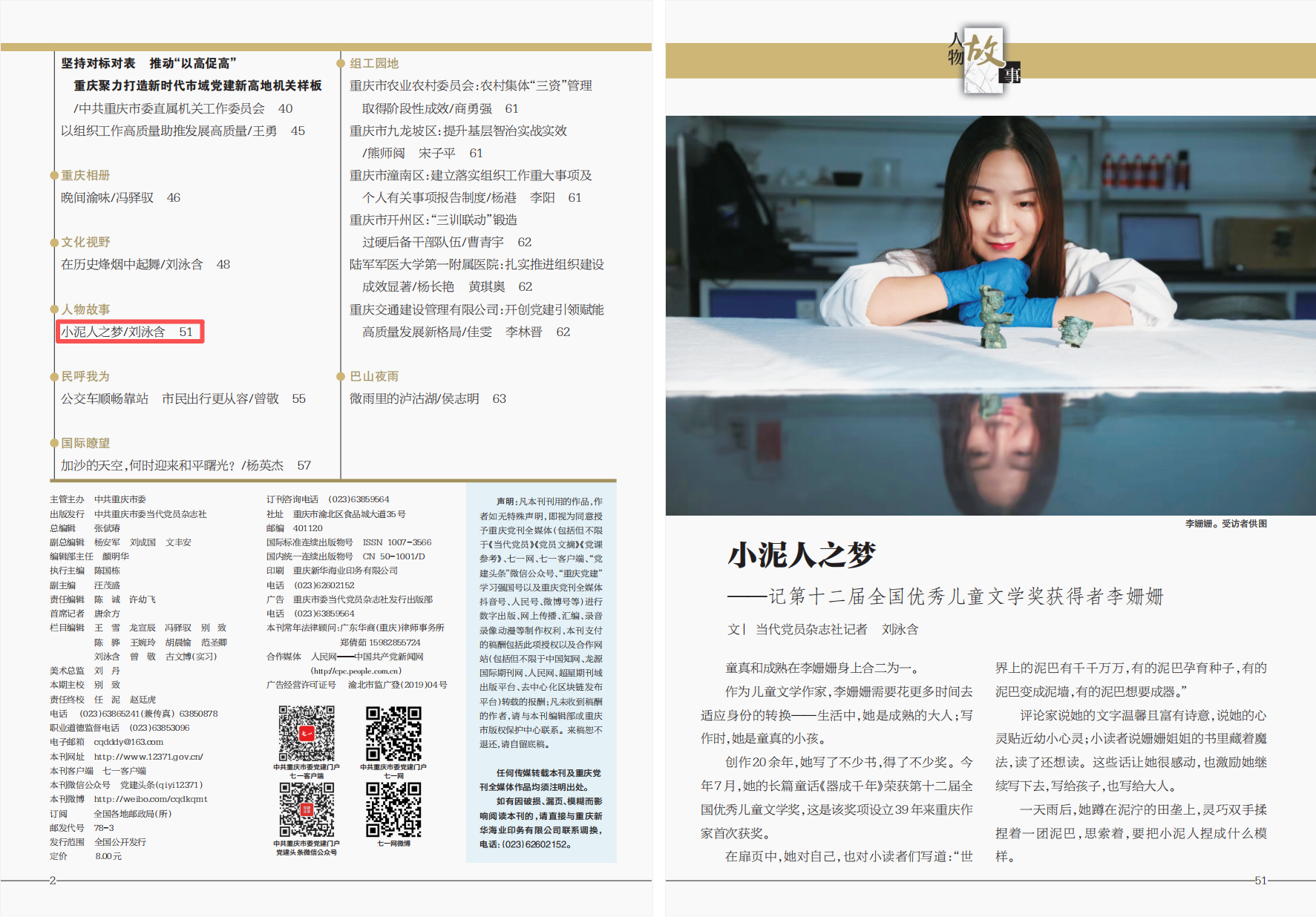 创作20余年,她写了不少书,得了不少奖。今年7月,她的长篇童话《器成千年》荣获第十二届全国优秀儿童文学奖,这是该奖项设立39年来重庆作家首次获奖。